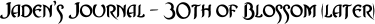 Jaden's journal, later, 30th Blossom, 801 (After lying in the darkness for about an hour, Jaden gets up, carefully, so as not to wake Lia. He goes back to his journal.) I cannot sleep. Though my body is exhausted, my mind won't stop. Andarta's prophecy chills me to my very soul, and when I close my eyes, all I see are massive tentacles, reaching toward the party from every direction. I told my darling that the prophecy was only a vision of what might be, and that it could be overcome. I told her that my own vision was less dark, that I could see my unborn children in her eyes. That is so true, but is it just wishful thinking? Who are the Winged Foxes that they might hope to defeat pirates, insane wizards and the whole Ardanian church? There are but five of us, six counting my lady, against legion... But somehow, I feel strong. As daunting as the task seems, for me, knowing that Lia waits at the end of the darkness gives me hope unexpected. I will fight on. I will come out at the end, with my comrades, and we will enter the gates of the guild in triumph. With God's help, with our friend's help, we will succeed against all odds. (A light is in his eyes, a flame in his heart as he writes these words. He has something to live for now. He will fight on. He busies himself with final preparation's for the journey ahead.)