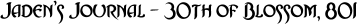 30th Blossom, 801 It's rather hard to see the page, as it's very dark. I am trying to write without waking my lady, who is quite worn out by the festivities and... all. [section deleted] We are packed and ready for the journey [to Freeport], and Lia has managed to book passage with a "good" pirate. She told me his name but I can't remember. Tonight, at the Beltaine festivities, I asked Lia what she hoped might happen for us. She brought joy into my heart when she told me she loved me. But she chilled it when she told me of a prophecy of Andarta's. She said that if Lia left the island with us, she would find love and passion, but at a great price. She also said that she saw the Winged Foxes walking into a great, soul destroying darkness, and that not all of us would walk out. I told my lady that prophecies can be wrong, but I fear that the darkness that I've felt all of these years may have been my own premonition, that any happiness I have is doomed to a short life. I don't want to believe this. The Ardanian church has a dark and vengeful God, but He is the only one I know. Would that I could come to know the Great Mystery that Raven worships, or the kind and fatherly God of the Angelican's. Maybe then, things wouldn't look so black. Sister Fara, for all her strength, seems to fear Stephen's title, Taoiseach, and Jotork is more gloomy than I'e ever seen him. A pall seems to have fallen over the party, and I have no skill to fight it. Part of me wishes the Blackcloaks would just make a move so I could feel my sword slice through their flesh. But I know that's not likely to happen unless they are sure of winning, and it seems as though they believe us to be dead. Good. They will be all the more surprised when we defeat them. Lia just turned over and cried out. My poor darling has taken wounds of her own at the hands of the pirates. I look forward to making them pay. It will have to wait, but I will come back and free these good people from their reign of terror. I must stop now and try to get a bit of rest before our journey. I pray it will be a safe one. (Jaden blows out the candle and climbs into bed with Lia. Anyone who has seen him fight would be surprised at how gently he holds her, like one would hold a wounded bird. He pulls the covers over them both, and tries to sleep.)
