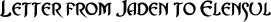 My Dear Elensul, One morning, just before my fifth birthday (I remember because I was very excited about it) I came outside into the garden. It was my Mother's favourite place and I knew I could find her there. She was dancing in front of a tree I had never seen before. I know now that it must have been an illusion. The tree was beautiful, gravid with yellow fruit and small yellow birds sang in it's branches. She was wearing a gown that was by turns blue, then green. The fabric was softer than the softest silk, it must have been Elvish in origin, for I haven't seen it's like since. She didn't notice me at first, and I stood spellbound, for she was so very lovely, but then she fixed a sad and frank gaze on me and said, "E'er long, I will leave you, little one. But you mustn't be afraid, for you will see me again one day, yonder." She raised one frail white hand and gestured toward the West. I began to cry, then, because I didn't want her to go. Soft her footfalls on the green It was the last time I saw her. I wanted you to have this picture of her, so you will always remember that Stephen and I share your grief, your sense of loss, and your quest for justice. Happy birthday, Elensul. Your Kindred, Jaden 25th Heat, 802